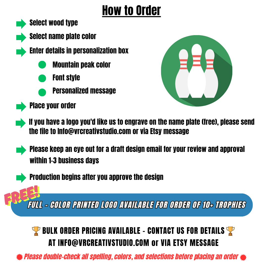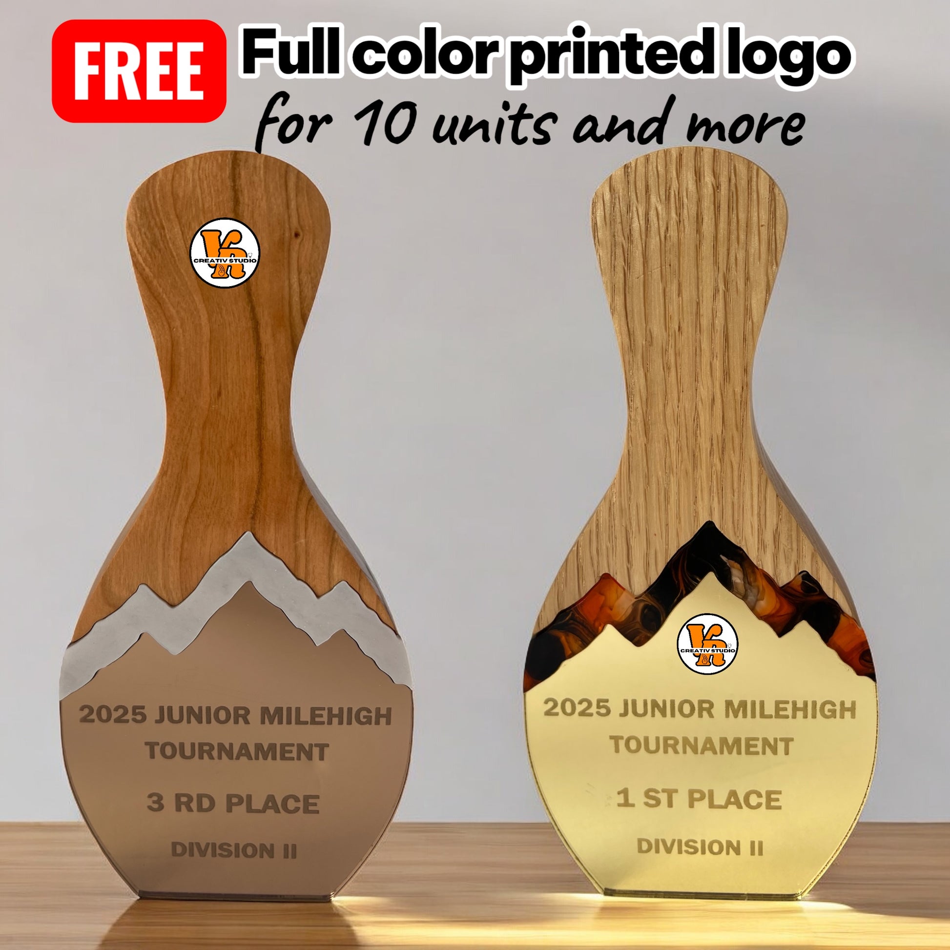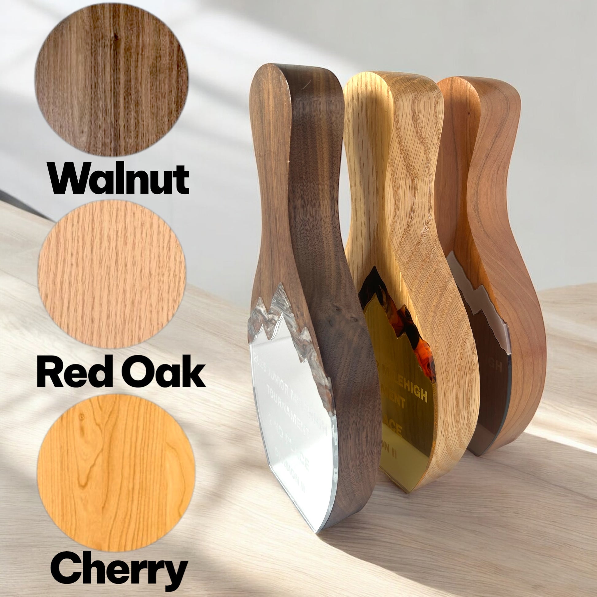 Celebrate bowling achievements with our handmade custom bowling trophies, crafted from high-quality wood and durable acrylic. Perfect for tournaments, leagues, and special bowling events, each trophy features a personalized engraved nameplate to commemorate your bowler's success.